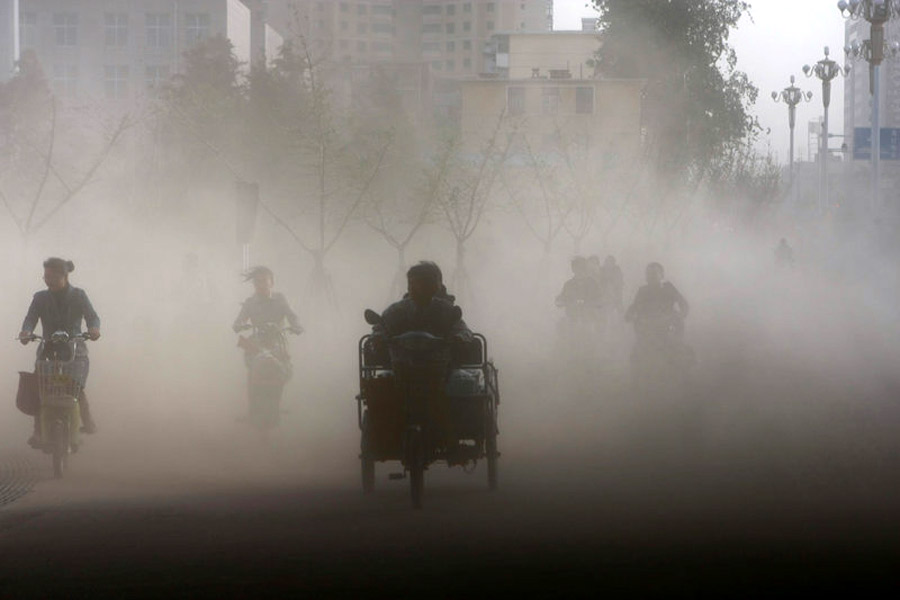 周日(18日), 河北石家莊,中華大街與裕華路交口,自行車(chē)在大風(fēng)引起的揚(yáng)塵中艱難前行。10月18日起,北方迎來(lái)大幅降溫,部分地區(qū)風(fēng)力將達(dá)8級(jí)。 阿拉爾 攝