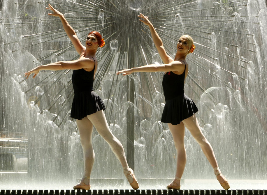 2009年10月23日,澳大利亞悉尼,來(lái)自紐約的全男班惹笑芭蕾舞團(tuán)The Trocks在噴泉邊起舞。高超的足尖技巧,優(yōu)美的芭蕾舞姿,加上怪異的動(dòng)作滑稽的表情,這些美國(guó)男子芭蕾演員們用一種另類的表現(xiàn)力顛覆了人們心中優(yōu)雅高貴的印象,讓觀眾欣賞傳統(tǒng)以外的男扮女裝芭蕾舞表演。