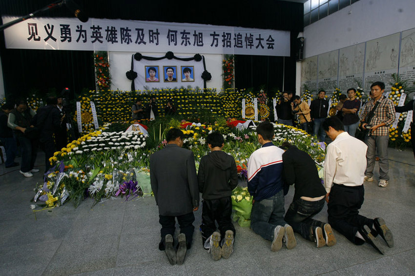 10月28日上午,湖北荊州市在市殯儀館舉行隆重追悼大會,悼念陳及時、何東旭、方招三位舍己救人大學(xué)生。數(shù)萬群眾趕到追悼會現(xiàn)場,手捧菊花為英雄道別。