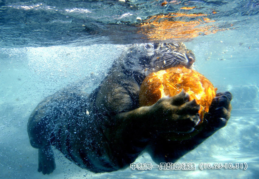 10月28日,美國(guó)加利福尼亞州Vallejo,六旗探索王國(guó)游樂(lè)園里的孟加拉虎在水下撕咬萬(wàn)圣節(jié)南瓜。>>點(diǎn)擊觀(guān)看詳細(xì)內(nèi)容