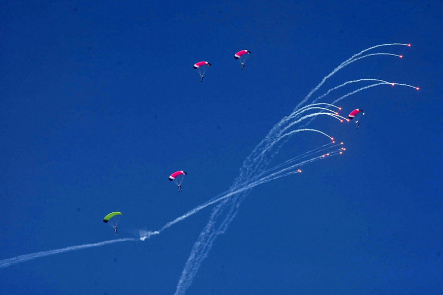 11月3日上午,慶祝空軍建軍60周年空中表演在沙河機場舉行首場預(yù)演。八一跳傘隊共有24名隊員表演開路先鋒、空中彩虹、歡慶盛典和仙女下凡4個節(jié)目。黑克 張穎川 攝