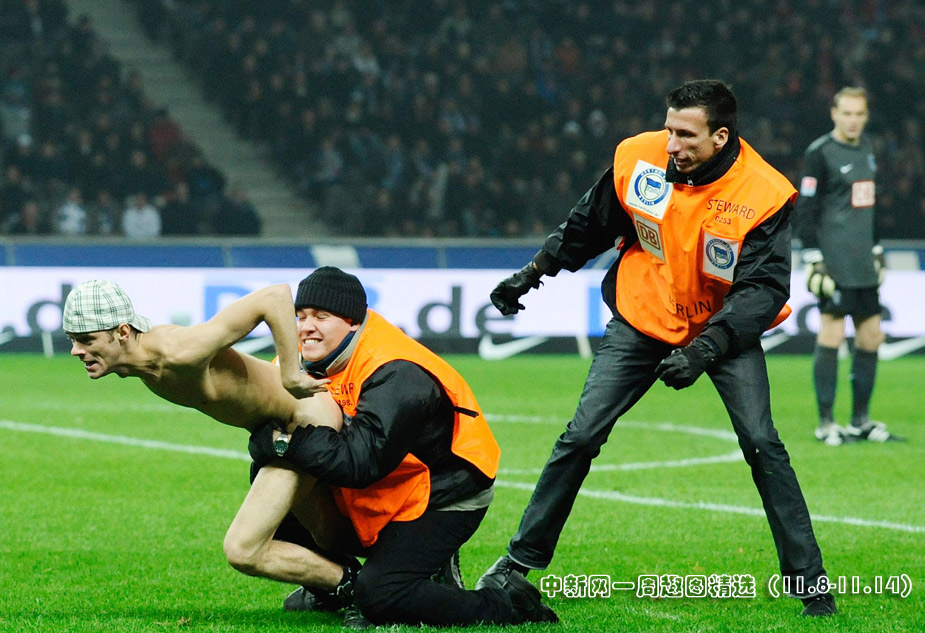 11月8日,09/10德甲第12輪賽事柏林赫塔主場0-1負于科隆,連續(xù)11輪聯(lián)賽不勝。一名憤怒的柏林赫塔球迷沖進球場內瘋狂的裸奔。圖片來源:中國新聞網(wǎng)>>點擊觀看詳細內容