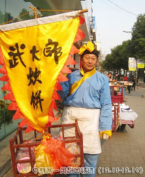 12月18日,46歲的山東省陽(yáng)谷縣李振生,身著青衣襟、白圍裙、黃頭巾,肩挑貨擔(dān)裝扮成武大郎的模樣在南京街頭走街串巷賣炊餅。圖片來源:中國(guó)新聞網(wǎng)>>點(diǎn)擊觀看詳細(xì)內(nèi)容