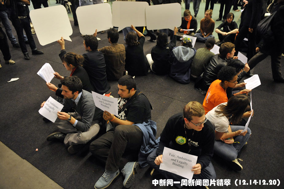 16日(周三),哥本哈根,一群年輕人在貝拉中心靜坐示威,要求聯(lián)合國氣候變化大會取得實質(zhì)成果。圖片來源:中國新聞網(wǎng)