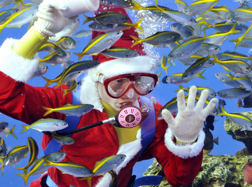 圖為東京橫濱八景島海洋樂(lè)園的潛水員著圣誕服飾潛入水中。