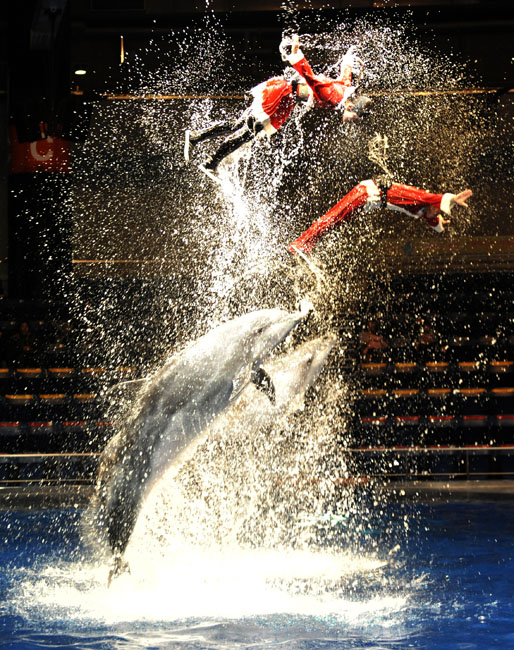 圖為東京水族館內(nèi)工作人員身著圣誕老人服裝訓練海豚。