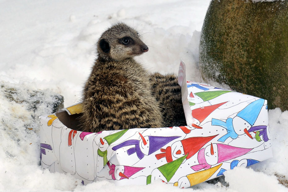 圖為德國(guó)北部城市漢諾威動(dòng)物園幾只收到了圣誕禮物的狐獴。