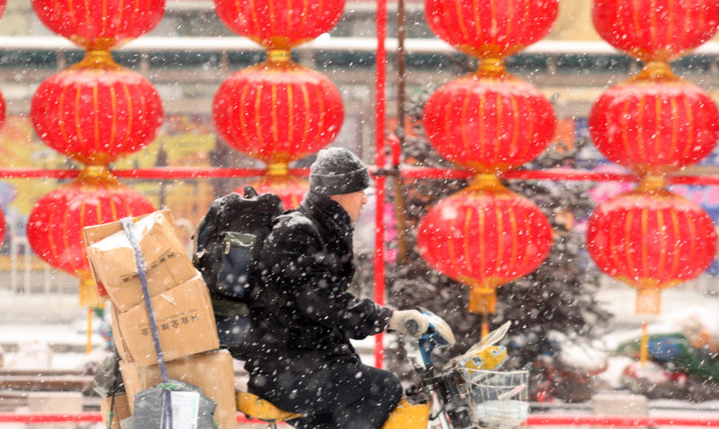 12月25日,受寒潮影響,哈爾濱大雪紛飛。圖為道里區(qū)經(jīng)緯街上,市民們從紅燈籠旁經(jīng)過。蘇強攝