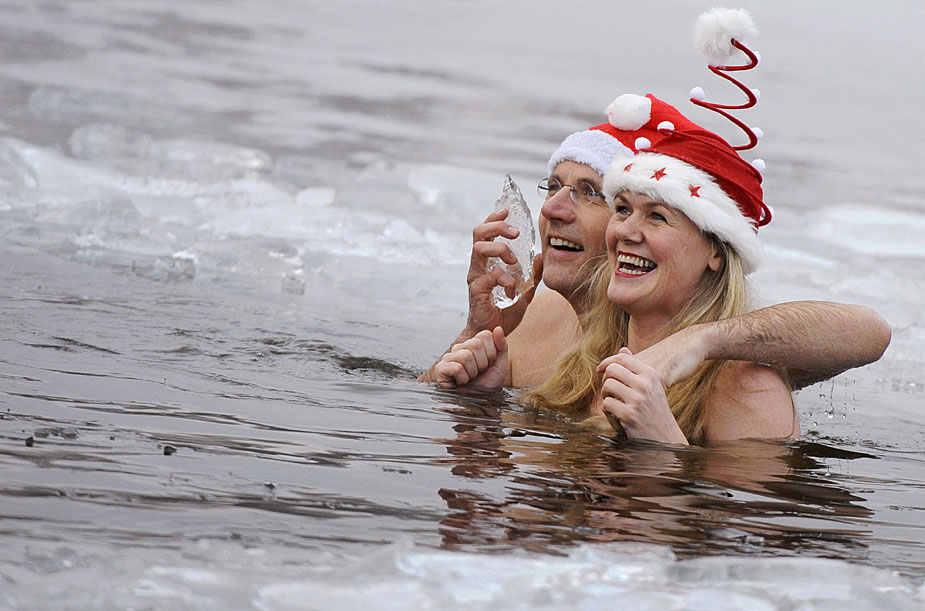 12月25日,德國(guó)柏林的冬泳俱樂部“柏林海豹”(Berliner Seehunde)的成員不畏寒冬,光著身子在已經(jīng)結(jié)冰的Oranke湖中暢游一番。圖片來源:中國(guó)新聞網(wǎng)
