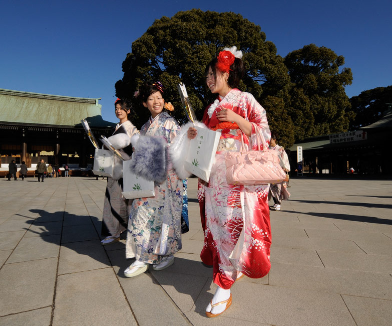 今年的1月11日,是日本傳統(tǒng)的成人節(jié),所有滿20歲的年輕人將宣告自己邁進了成人行列。1月8日,日本一家公司年滿20歲的年輕女孩紛紛穿上和服,到廟宇中祈福,提前慶祝成人節(jié)的到來。