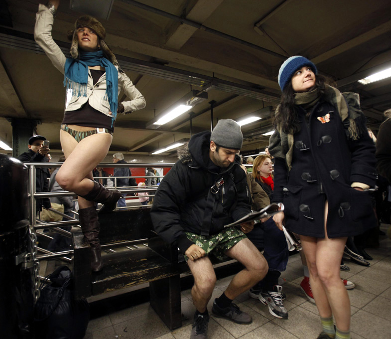 2010年1月10日,紐約,地鐵里一群不穿褲子的乘客。第9屆“不穿褲子乘地鐵”活動當日在全球16個國家的44座城市舉行。圖片來源:中國新聞網(wǎng)