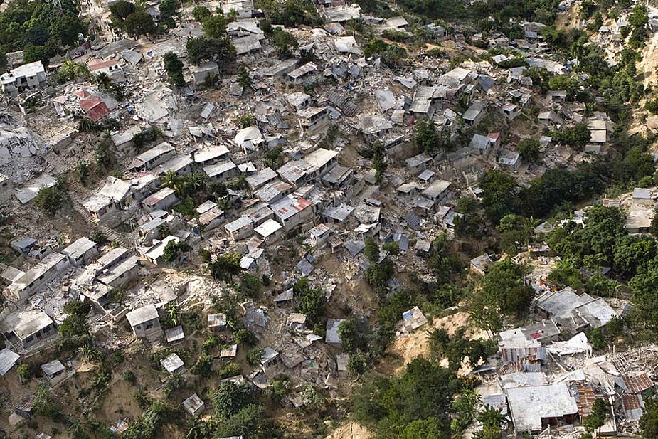 倒塌的棚屋,可以看見在巨大的瓦礫廢墟中,有當(dāng)?shù)厝嗽趯?shí)施救援。
