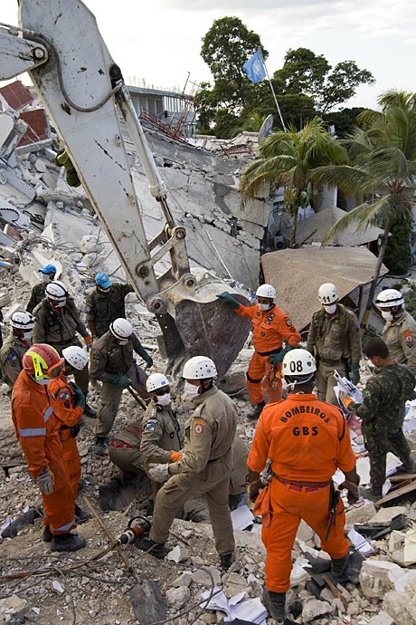 1月16日,海地首都太子港,中國國際救援隊在聯(lián)海團總部對遇難者進行搜尋工作。此前八名中方失蹤人員的遺體已全被找到。圖片來源:中國新聞網(wǎng)