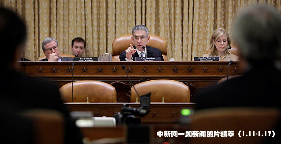 1月13日(周三),金融危機(jī)調(diào)查委員會(huì)(Financial Crisis Inquiry Commission)主席安吉利得斯(Phil Angelides,中)在國(guó)會(huì)山(Capitol Hill)一個(gè)聽證會(huì)上提問。在談及某個(gè)問題時(shí),他將高盛集團(tuán)(Goldman Sachs)一位高管比作二手車推銷員。圖片來源:中國(guó)新聞網(wǎng)