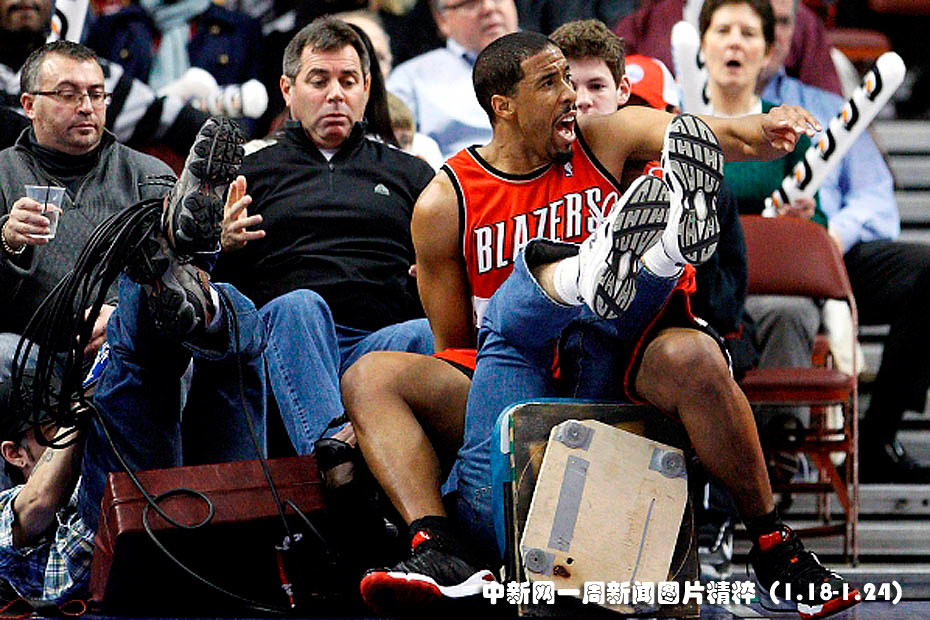 1月20日,波特蘭開創(chuàng)者隊后衛(wèi)米勒在客場對陣費城76人隊的比賽中搶球撞上場邊的電視臺工作人員。波特蘭開創(chuàng)者最終以98比90擊敗費城76人隊。圖片來源:中國新聞網(wǎng)
