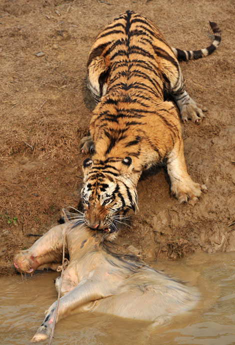 但水中的牦牛一動彈,更加激發(fā)了老虎的野性,這時有三、四只老虎撲了上來,工作人員拼命往水塘邊上拽牦牛,無奈一只虎王一下就咬住了牦牛的脖子怎么都不肯松口,繼而上演了人和老虎的“拔河比賽”。
