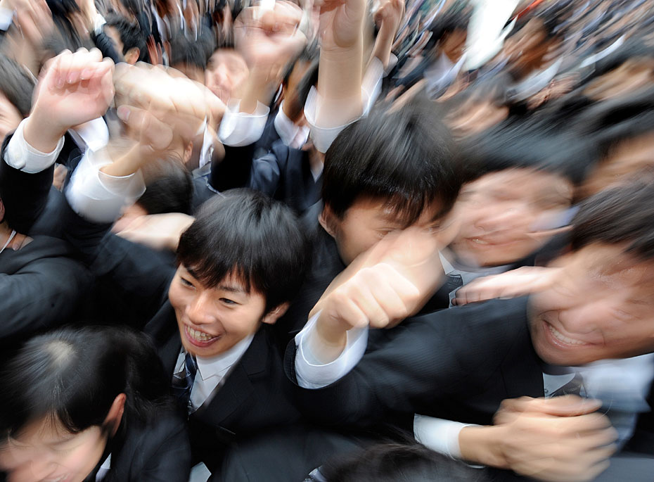 2月10日,日本東京職業(yè)學(xué)校的學(xué)生在求職動員會上伸出拳頭展現(xiàn)信心。日本的失業(yè)率達5%,2011屆畢業(yè)生將面臨嚴峻就業(yè)形式。圖片來源:中國新聞網(wǎng)