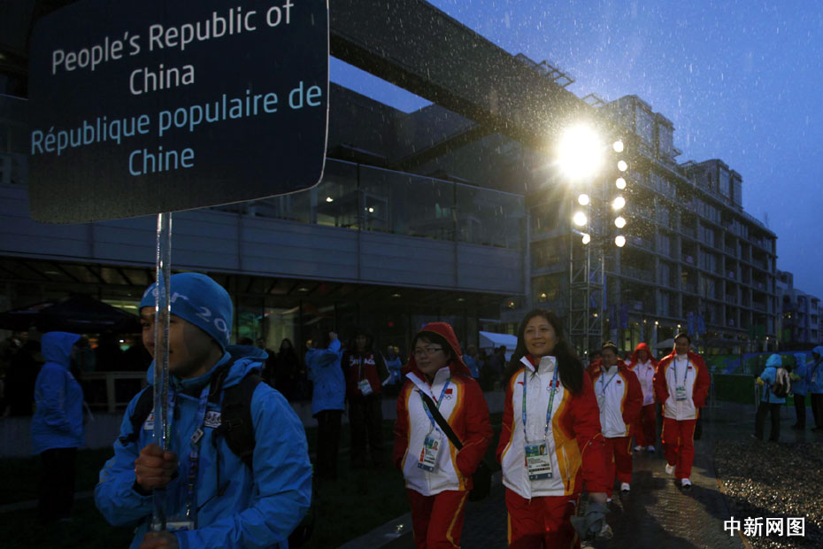 圖為中國(guó)冬奧代表團(tuán)冒雨參加升旗儀式。