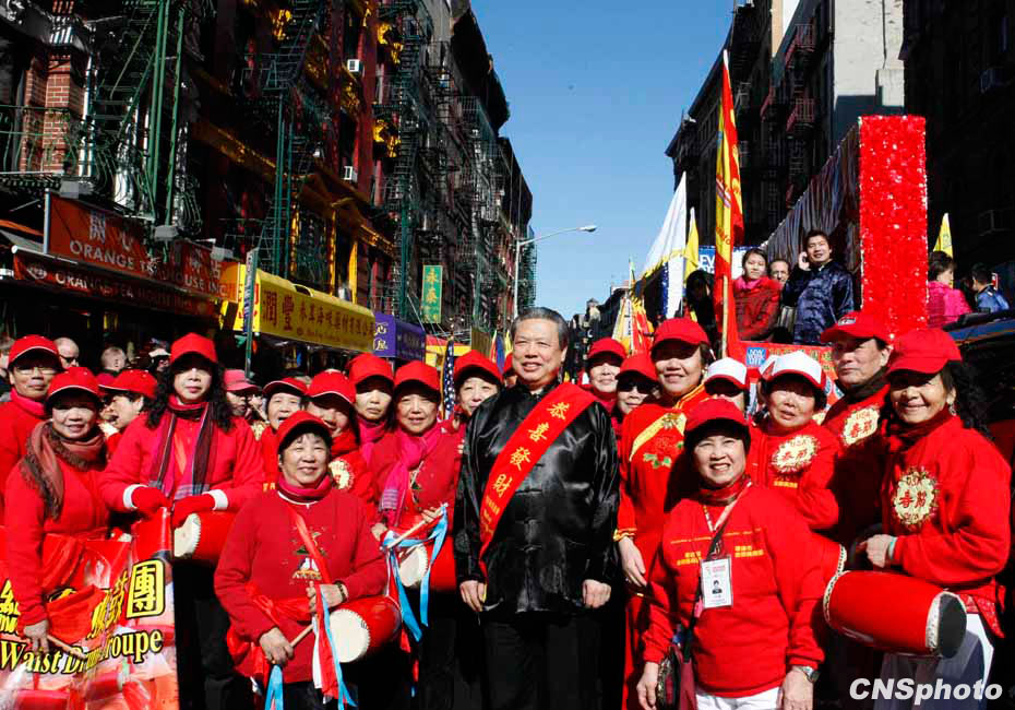 虎年紐約華埠慶祝農(nóng)歷新年“重頭戲”花車大游行21日登場,吸引超過10萬人圍觀共同狂歡,成為歷年來參加人數(shù)最多的一次花車游行。12輛盛裝花車以及數(shù)千人的表演團(tuán)隊沿著華埠最熱鬧的數(shù)十條街道一邊行進(jìn)一邊表演,滿天彩帶飄揚(yáng),場面熱鬧非常。圖為中國駐紐約總領(lǐng)事彭克玉在游行隊伍中。中新社發(fā) 魏晞 攝
