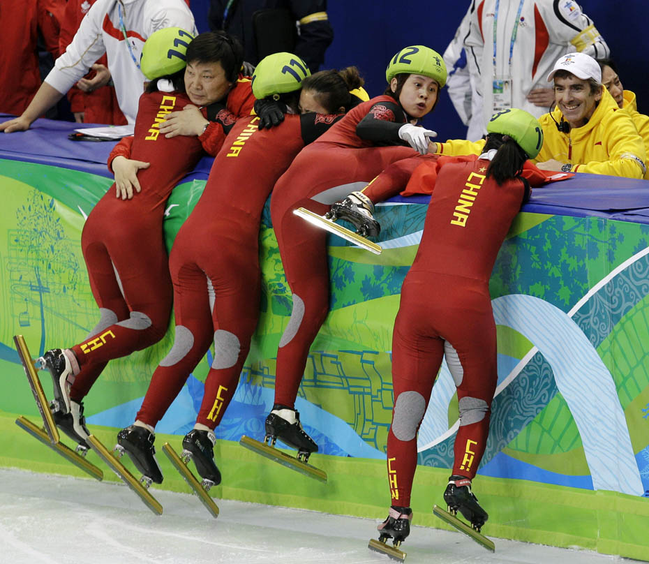 當(dāng)?shù)貢r(shí)間2月24日,溫哥華冬奧會(huì)女子短道速滑3000米接力A組決賽中,中國(guó)隊(duì)王濛、周洋、孫琳琳、張會(huì)四朵金花聯(lián)袂出擊,最終將金牌歸入中國(guó)隊(duì)囊中。圖片來(lái)源:中國(guó)新聞網(wǎng)