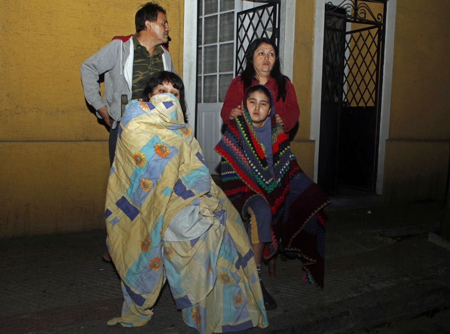美國地震勘測局報(bào)告稱,智利康塞普西翁省附近當(dāng)?shù)貢r(shí)間27日凌晨發(fā)生里氏8.8級(jí)強(qiáng)烈地震,首都圣地亞哥有明顯震感。智利總統(tǒng)巴切萊特已宣布國家進(jìn)入“災(zāi)難狀態(tài)”。目前強(qiáng)烈地震造成的死亡人數(shù)已經(jīng)升至78人。圖為在智利首都圣地亞哥,正在熟睡中的人們感到地震后紛紛走到戶外。