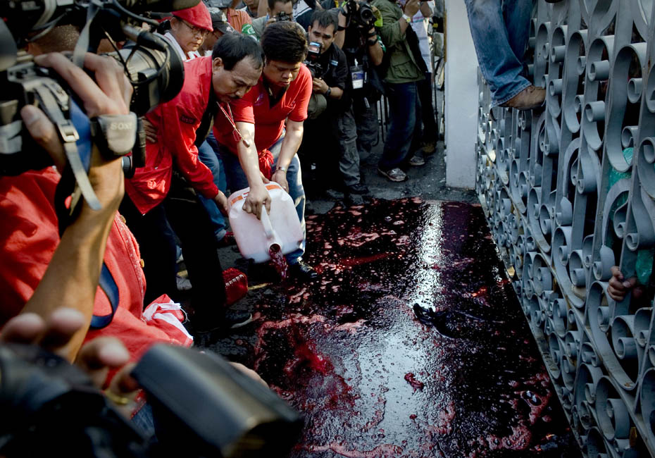 泰國反政府組織“紅衫軍”成員將血液潑灑在曼谷總理府門前,以此向政府施壓要求解散國會(huì)下議院。圖片來源:中國新聞網(wǎng)