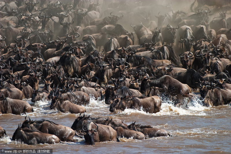 3月17日消息,捷克野生動(dòng)物攝影師瓦拉夫·希爾哈(Vaclav Silha)在肯尼亞馬賽瑪拉(Masai Mara)國(guó)家保護(hù)區(qū)拍到了罕見(jiàn)的牛羚大遷移場(chǎng)面。上百萬(wàn)牛羚集體穿越馬拉河,同時(shí)為了防止被水中的鱷魚(yú)咬到及逃避岸邊叢林里的老虎,牛羚群制造出巨大的聲響并急沖到對(duì)岸。barcroftmedia/CFP