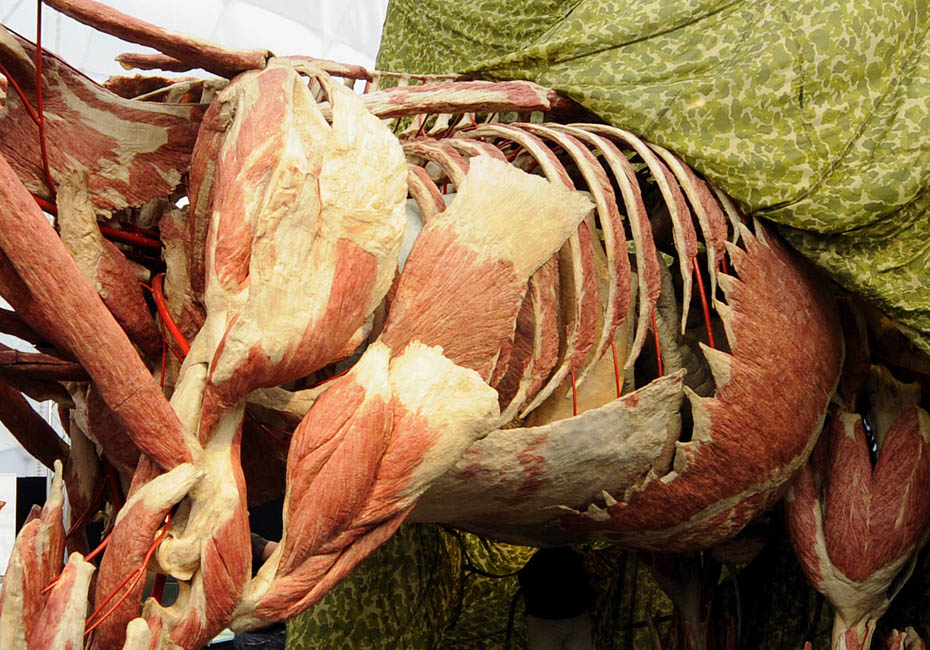 德國著名解剖學(xué)家鞏特爾·馮·哈根斯博士被稱為“死亡先生”,目前展出的是有史以來的最大的動物尸體。體型巨大的“桑芭”尸體高3.5米,重3.2噸。據(jù)悉“桑芭”將于2010年4月歸還諾因基興動物園。圖片來源:中國新聞網(wǎng)