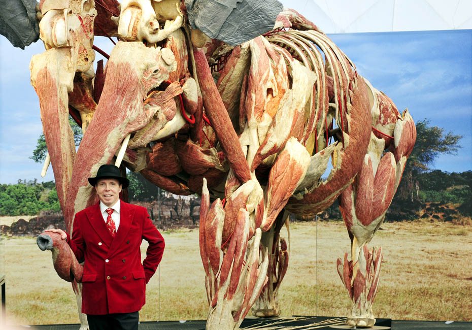 德國著名解剖學(xué)家鞏特爾·馮·哈根斯博士被稱為“死亡先生”,目前展出的是有史以來的最大的動(dòng)物尸體。體型巨大的“桑芭”尸體高3.5米,重3.2噸。據(jù)悉“桑芭”將于2010年4月歸還諾因基興動(dòng)物園。圖片來源:中國新聞網(wǎng)