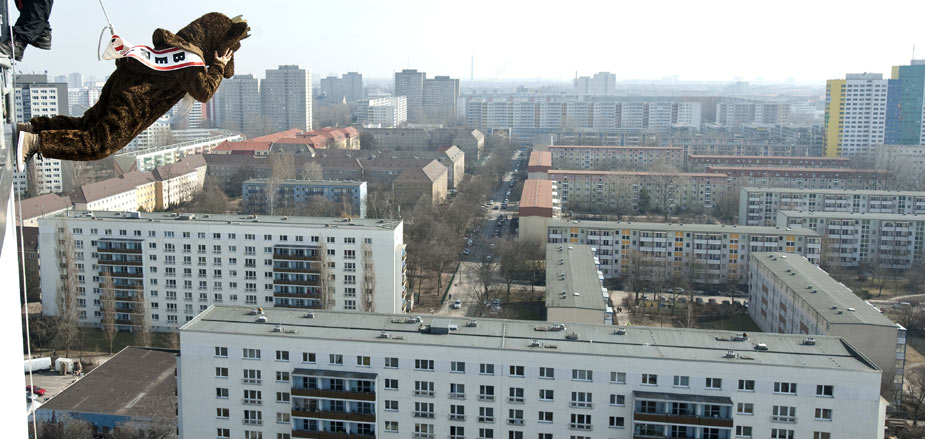 3月18日,在德國柏林舉行的“高樓漫步”活動(dòng)中,一名女子打扮成熊的模樣(柏林的象征)在天使酒店外墻上行走,參加活動(dòng)的人都有繩索保護(hù)。