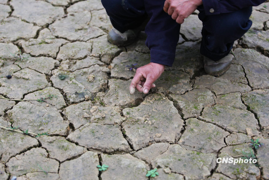 3月23日,重慶武隆縣玉荷村一座水塘已完全干涸,原本池底的淤泥干裂成塊。重慶武隆縣自去年入冬以來,相繼遭受冬干春旱,塘庫蓄水量劇減,人飲蓄水池干枯,溪溝斷流。目前,該縣部分水庫出現(xiàn)枯竭狀況,14.95萬人飲水困難,占總?cè)丝诘?7%。預(yù)計到4月中旬,武隆飲水困難人口將達到18萬人。中新社發(fā) 郭晉嘉 攝
