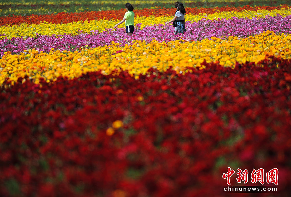 美國加利福尼亞州圣迭戈的卡爾斯巴德花田近日繁花盛開,姹紫嫣紅的花朵整齊地鋪滿在五十英畝的土地上,一望無垠的花海,美不勝收。圖片來源:中國新聞網(wǎng)