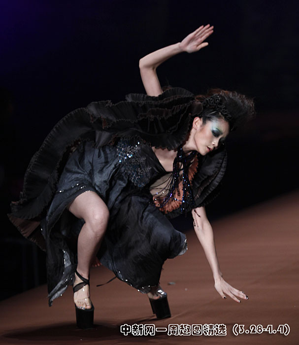3月29日晚,旭化成·中國時裝設(shè)計師創(chuàng)意大獎張義超作品發(fā)布會在北京舉行,一名模特在T型臺上“失足”摔倒。圖片來源:中國新聞網(wǎng)>>點擊觀看詳細內(nèi)容