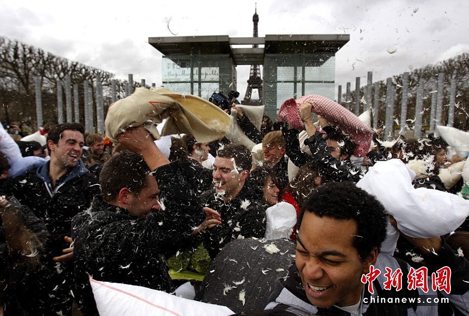 4月3日是國(guó)際“枕頭大戰(zhàn)”日。在這一天,多個(gè)國(guó)家的“枕頭大戰(zhàn)”愛(ài)好者相約走上街頭,用獨(dú)特的方式來(lái)慶祝他們的節(jié)日。圖片來(lái)源:中國(guó)新聞網(wǎng)