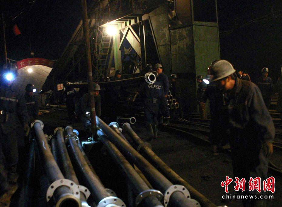28日下午,華晉焦煤有限責任公司王家?guī)X煤礦發(fā)生透水事故。經(jīng)核查,初步確認事故發(fā)生時當班下井261人,升井108人,有153人被困井下。圖為礦工在井下運送搶險設(shè)備。中新社發(fā) 張云 攝