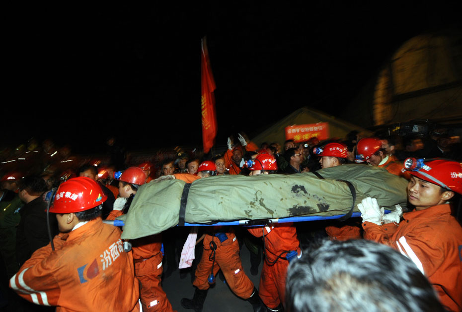 4月5日,首批獲救礦工被抬出井口。當日,華晉焦煤王家?guī)X礦“3·28”透水事故首批獲救礦工升井,被急救車送往醫(yī)院救治。目前現(xiàn)場救援工作仍在進行。圖片來源:新華網 燕雁 攝