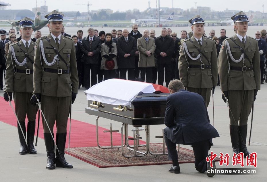 4月10日,卡欽斯基乘坐專機(jī)從華沙飛往俄羅斯斯摩棱斯克市,參加卡廷森林事件70周年紀(jì)念活動(dòng)。途中飛機(jī)在斯摩棱斯克“北方”軍用機(jī)場(chǎng)附近降落時(shí)失事,共造成包括卡欽斯基夫婦及眾多政府高官在內(nèi)的96人死亡。慘劇發(fā)生后,舉世震驚。圖為波蘭總理圖斯克在卡欽斯基遺體前跪拜。