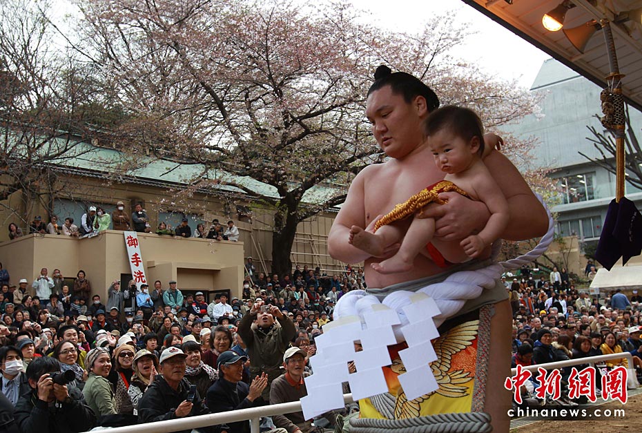 4月9日,來自世界各地的相撲選手齊聚日本東京靖國神社內(nèi)的相撲館參加為期一天的日本供奉大相撲比賽。圖片來源:中國新聞網(wǎng)
