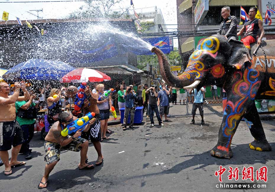 4月12日,泰國(guó)迎來(lái)一年一度的潑水節(jié),在拷桑路旅游區(qū)人們用水槍與大象“互噴”希望為對(duì)方送上祝福同時(shí)慶祝泰國(guó)新年。圖片來(lái)源:中國(guó)新聞網(wǎng)