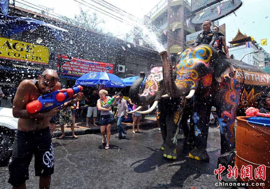 4月12日,泰國迎來一年一度的潑水節(jié),在拷桑路旅游區(qū)人們用水槍與大象“互噴”希望為對方送上祝福同時慶祝泰國新年。圖片來源:中國新聞網(wǎng)
