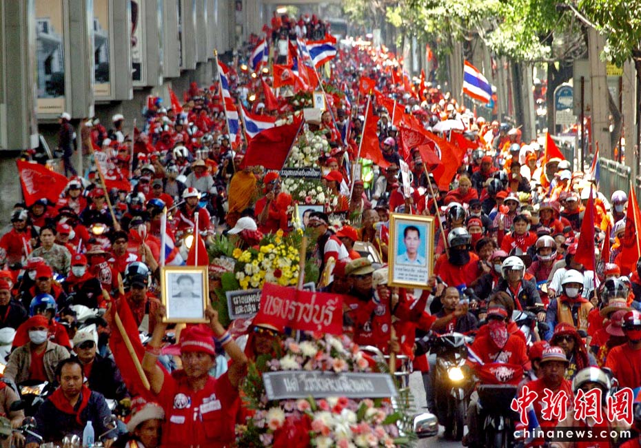 當(dāng)?shù)貢r(shí)間4月12日,泰國紅衫軍在曼谷市區(qū)抬著棺材舉行游行,借此向政府施壓促阿披實(shí)下臺(tái)。此前紅衫軍示威者與軍警發(fā)生沖突,造成21人死亡。圖片來源:中國新聞網(wǎng)