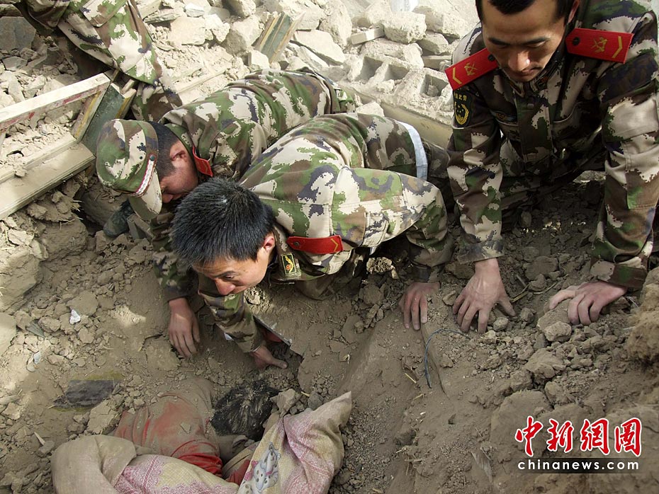 圖為4月14日11時,武警玉樹支隊的戰(zhàn)士在玉樹縣結(jié)古鎮(zhèn)地震廢墟里救助被困民眾。中新社發(fā) 張守國 攝