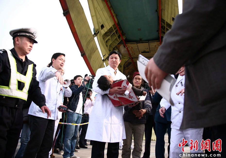 一架載有青海玉樹地震首批傷員及傷員家屬的中國空軍運(yùn)輸機(jī)抵達(dá)成都雙流國際機(jī)場,其中35名地震傷員將被分別送往四川省人民醫(yī)院和四川大學(xué)華西醫(yī)院進(jìn)行治療,運(yùn)輸機(jī)于15日下午15時30分從玉樹當(dāng)?shù)貦C(jī)場起飛,經(jīng)過1小時30分的飛行,歷程800公里,于4月15日下午17時03分,順利抵達(dá)成都。圖為醫(yī)院搶救人員正將受傷小孩從飛機(jī)抱往救護(hù)車。中新社發(fā) 張浪 攝