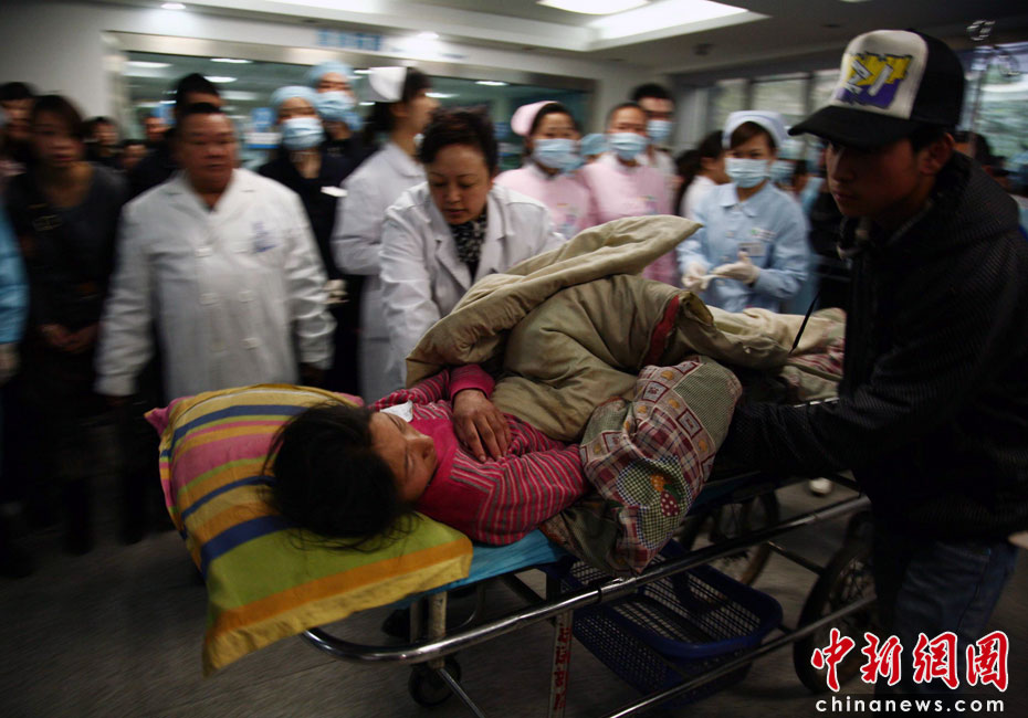 4月15日下午5時40分,首批青海玉樹地震傷員被送往四川省人民醫(yī)院進(jìn)行治療,這批傷員于15日下午5時許隨著中國空軍運輸機(jī)抵達(dá)成都,每位傷員均有親人、家屬陪同。圖為即將被送進(jìn)急救中心的地震傷員。中新社發(fā) 張浪 攝