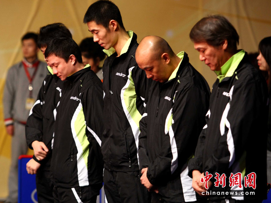 4月15日,亞歐乒乓球全明星對抗賽在北京進行第二天的爭奪。賽前,現(xiàn)場所有球員和觀眾為青海玉樹地震災(zāi)區(qū)的遇難同胞默哀一分鐘,組委會宣布將把本次賽事的全部票房收入捐贈地震災(zāi)區(qū)。中新社發(fā) 富田 攝