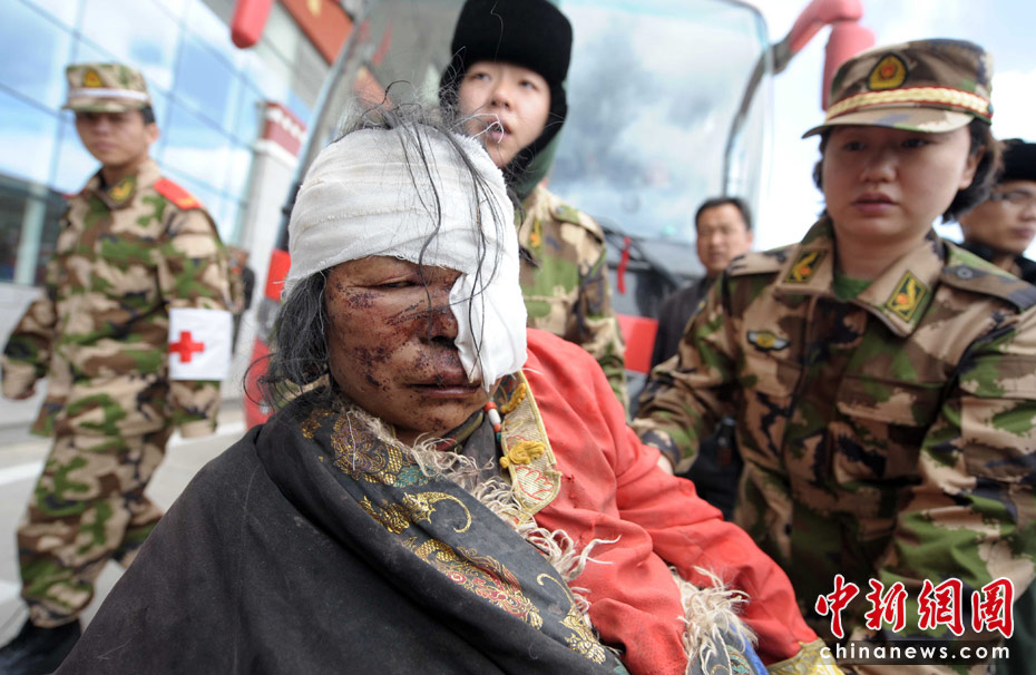 圖為4月15日下午,玉樹地震重傷員用各種交通工具送達機場,廣東邊防總隊醫(yī)療救援隊,用被褥接轉(zhuǎn)傷員。中新社發(fā) 陳文 攝