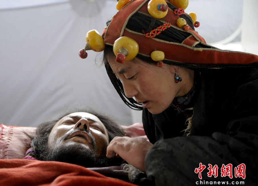 4月16日,青海玉樹體育場武警醫(yī)院醫(yī)療隊的帳篷里,東周丹增的妻子陪護丈夫接受治療。東周丹增在地震中肋骨骨折。 中新社發(fā) 廖攀 攝
