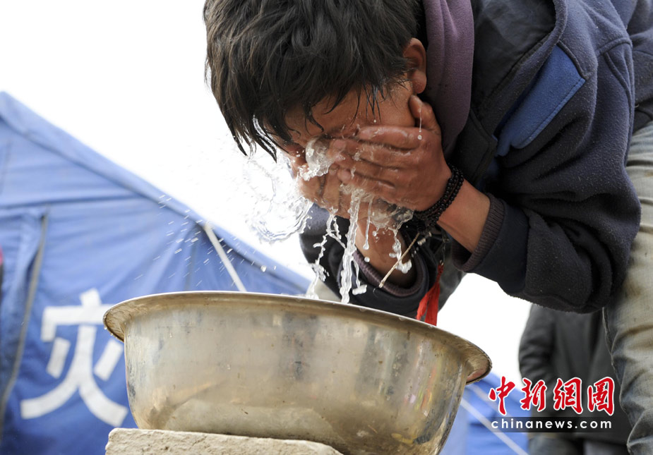 4月16日,青海玉樹體育場地震受災民眾安置點,一位居民用清水洗臉。隨著救災物資的到位,受災民眾生活得到基本保障。 中新社發(fā) 廖攀 攝