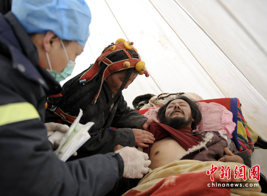 4月16日,青海玉樹體育場地震災民安置點,武警醫(yī)院醫(yī)療隊醫(yī)務人員來到東周丹增家的帳篷里為傷者檢查身體。中新社發(fā) 廖攀 攝