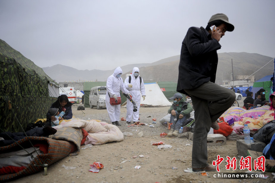 4月16日,青海玉樹體育場地震災(zāi)民安置點(diǎn),青海疾控中心展開防疫消毒工作。中新社發(fā) 廖攀 攝